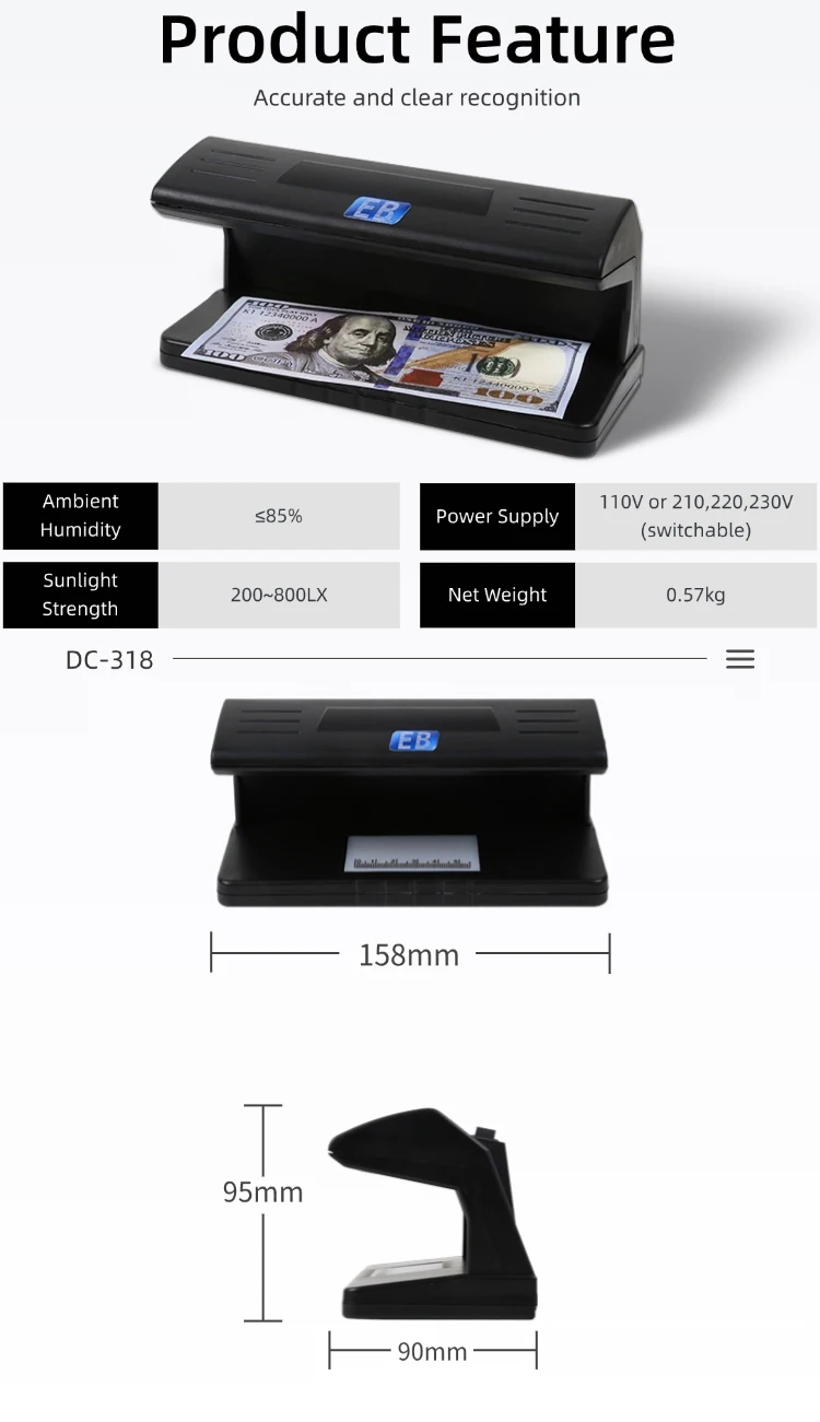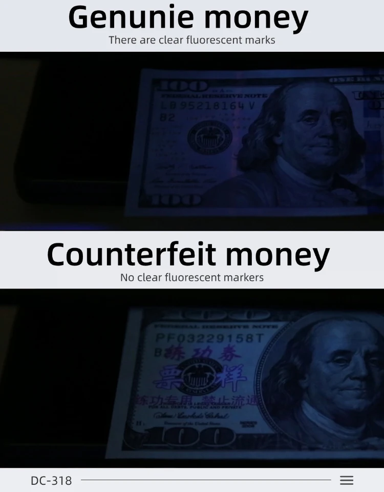 मुख्य बिक्री बिन्दुहरू• UV लाइट प्रविधि – नोट, कार्ड र ID मा रहेका सुरक्षा चिन्हहरू छिटो र स्पष्ट रूपमा देखाउँछ।